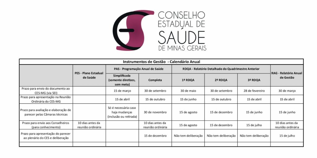 O plenário do CES aprovou o cronograma de apresentação dos instrumentos de gestão pela SES ao CES/MG. Segue: